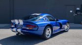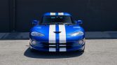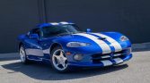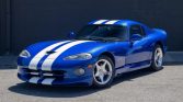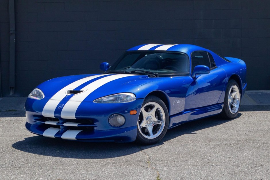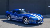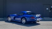 This 1997 Dodge Viper GTS is finished in Viper GTS Blue with white stripes over black leather and is powered by an 8.0-liter V10 paired with a six-speed manual transmission. Equipment includes a limited-slip differential, 17″ five-spoke wheels, and projector-style headlights.