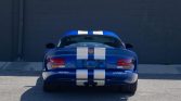 The car is finished in Viper GTS Blue with white racing stripes and features projector-style headlights, fog lights, a vented hood, and dual center-exit exhaust outlets.
