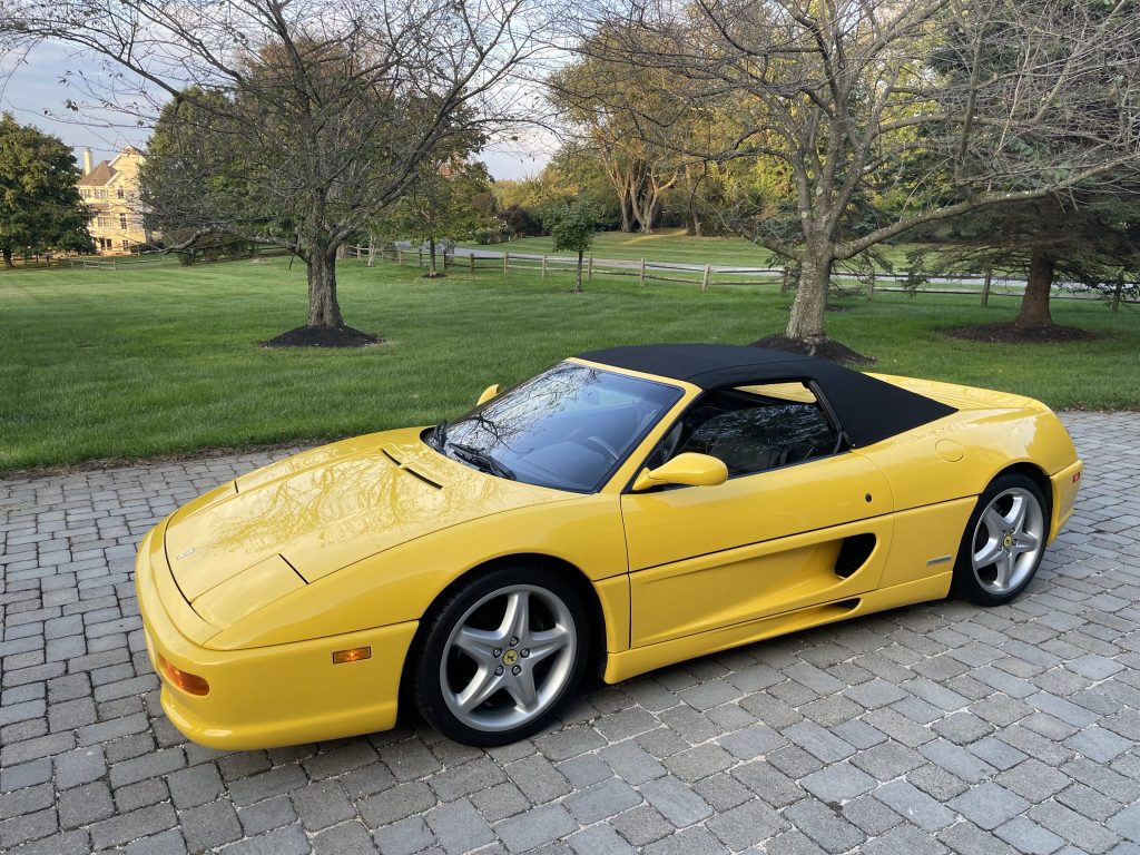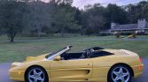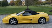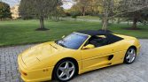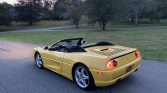 The Pininfarina-designed body is finished in Giallo Modena and features a black convertible soft top as well as pop-up headlamps, integrated fog lights, a vented engine cover, an integrated rear decklid spoiler, quad exhaust outlets, and air intakes on the doors and rocker panels.
