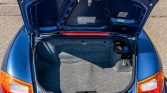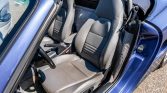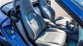 The bodywork is finished in Zenith Blue Metallic (L3AX) and paired with a Metropol Blue power-operated soft top. A body-color removable hardtop and storage stand are included in the sale. Additional exterior details include black rear bumperettes, roll hoops behind the seats, an integrated wind deflector, a central exhaust outlet, and a speed-activated rear spoiler.