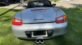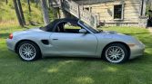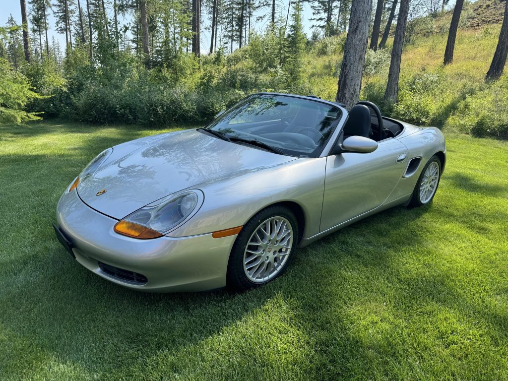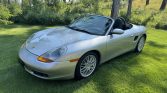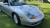 This 2000 Porsche Boxster is powered by a 2.7-liter flat-six that is modified with a TPC Racing turbocharger kit and exhaust system. The car has 22k miles and is finished in Arctic Silver Metallic over black full leather and equipped with a five-speed manual transaxle. Features include a power-operated black soft top, 17″ Sport Classic wheels, a speed-activated rear spoiler, and a Hi-Fi sound system.