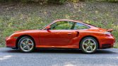 This 2001 Porsche 911 Turbo coupe is finished in Zanzibar Red over black full leather and was initially collected via tourist delivery. Equipment includes a speed-activated rear spoiler, a sunroof, xenon headlights, chrome-finished 18″ Turbo Twist wheels, Digital Sound Processing, and a Kenwood touchscreen head unit with smartphone connectivity. Power is provided by a twin-turbocharged 3.6-liter Mezger flat-six linked with a five-speed Tiptronic automatic transaxle.