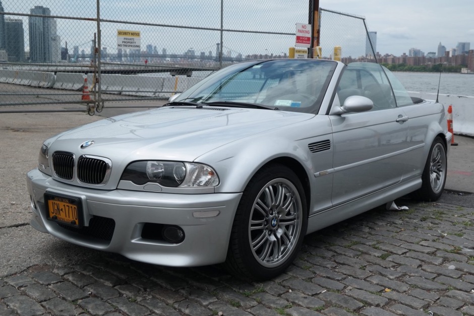 This 2002 BMW M3 convertible is finished in silver over black leather and is powered by a 3.2-liter inline-six paired with a six-speed manual transmission. Additional equipment includes a black convertible soft top, xenon headlights, 18″ alloy wheels, heated and power-adjustable front sport seats, and a Pioneer CD stereo with a trunk-mounted subwoofer. The car has been registered in New York and New Jersey since new and was acquired by the seller in 2019.