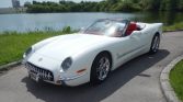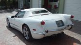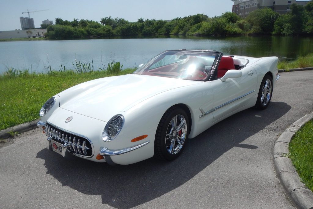 The car is finished in Arctic White with a matching convertible soft top and was modified by AAT with custom bodywork inspired by the 1953 C1 Corvette. Additional features include a bright grille and trim, retro-style lights and badging, and quad exhaust outlets.