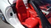 The cabin features red leather upholstery, matching carpeting, and white trim on the steering wheel and lower dashboard. Amenities include a head-up display, dual-zone climate control, cruise control, and power-adjustable bucket seats with position memory.