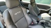 The cabin features power-adjustable front seats upholstered in black leather with “GTO” embroidered on the backrests, while silver-finished trim accents the dashboard and center console. Amenities include air conditioning, cruise control, aluminum pedal covers, and a 10-speaker Blaupunkt audio system with an in-dash six-disc CD stereo.