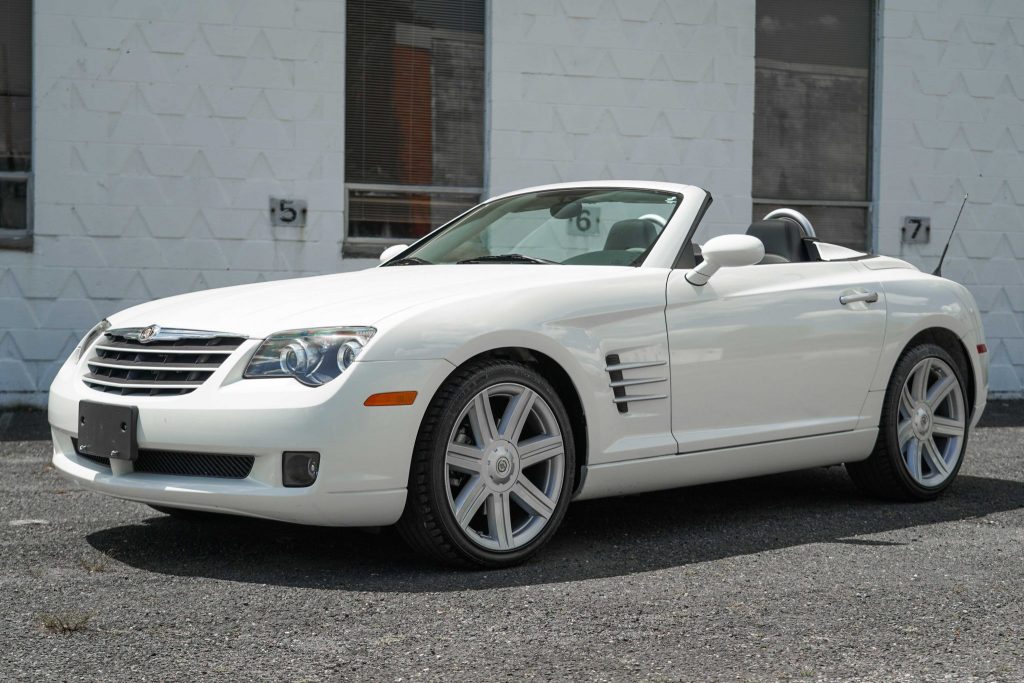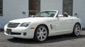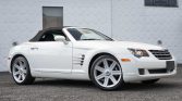 This 2005 Chrysler Crossfire Limited Roadster is finished in white over grey leather and powered by a 3.2-liter V6 paired with a five-speed automatic transmission. Equipment includes a power-operated black soft top, an active rear spoiler, staggered-diameter wheels, power-adjustable heated seats, and an Infinity CD stereo with navigation. The car was registered in Maryland prior to being recently acquired by the seller.