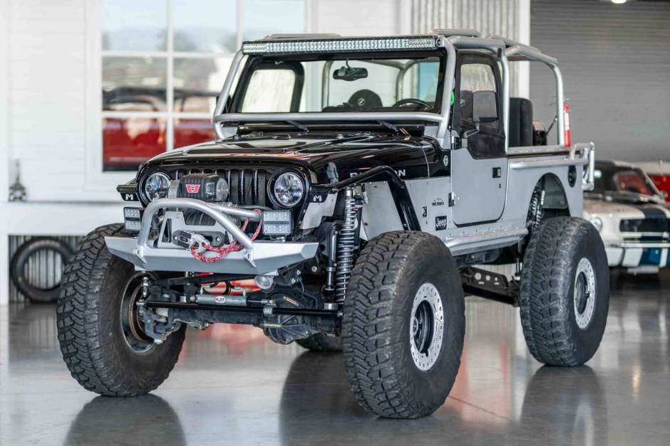 This 2005 Jeep Wrangler Unlimited Rubicon was the subject of a custom build that included the installation of an Atlas twin-stick transfer case, Dynatrac axles, Fox Racing remote-reservoir coilovers, and a custom multi-link suspension setup by Poly Performance as well as beadlock-capable 17″ Trail Ready wheels mounted with 40″ Goodyear tires. Power is provided by a 4.0-liter inline-six mated to a four-speed automatic transmission, and during the build, a tubular roll cage, protective body cladding, LED auxiliary lights, and an aftermarket front bumper with a Warn winch were also installed. The truck is finished in black and silver and is further equipped with ARB air-actuated differential lockers, an onboard compressor, a Premier Power Welder, metal half doors, and a roof-mounted solar panel. Inside, black cloth Corbeau bucket seats with four-point harnesses have been fitted, and further appointments include air conditioning, a factory navigation system, and a Bluetooth-capable Alpine head unit.