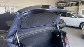 The car is finished in Slate Blue and features a blue soft top with a heated glass rear window. Exterior equipment includes bi-xenon headlamps with washers, rear parking sensors, and integrated dual exhaust outlets with polished finishers. The front bumper cover was reportedly repainted in 2020, and the Carfax report notes an accident involving a stationary object in May 2020 and “minor damage” to the left front in March 2021.