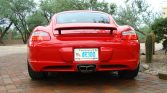 Staggered-width 18″ Cayman S five-spoke wheels feature Porsche-crest center caps and are wrapped in 235/40 front and 265/40 rear Michelin Pilot Sport tires that show 2006 date codes. Eibach 10mm rear wheel spacers have been added, and braking is handled by red-finished Porsche-branded calipers over ventilated and cross-drilled rotors.