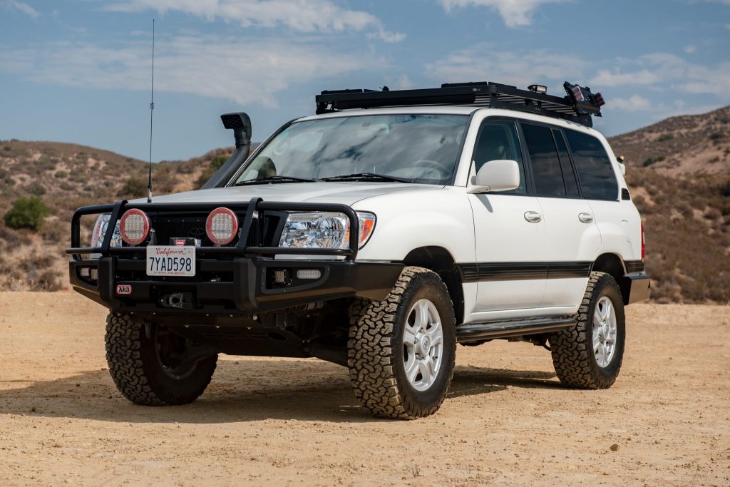 This 2006 Toyota Land Cruiser is finished in white over beige and is powered by a 4.7-liter V8 paired with a five-speed automatic transmission, a dual-range transfer case, and a locking center differential. Equipment includes a sunroof, an aftermarket roof rack, an ARB front bumper with a Warn winch, a Slee rear bumper and tire carrier, Slee rock sliders, a dual battery system, aftermarket LED fog and roof lights, ARB front and rear air lockers, heated front seats, and a Pioneer AM/FM/CD stereo and navigation system.