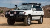 This 2006 Toyota Land Cruiser is finished in white over beige and is powered by a 4.7-liter V8 paired with a five-speed automatic transmission, a dual-range transfer case, and a locking center differential. Equipment includes a sunroof, an aftermarket roof rack, an ARB front bumper with a Warn winch, a Slee rear bumper and tire carrier, Slee rock sliders, a dual battery system, aftermarket LED fog and roof lights, ARB front and rear air lockers, heated front…