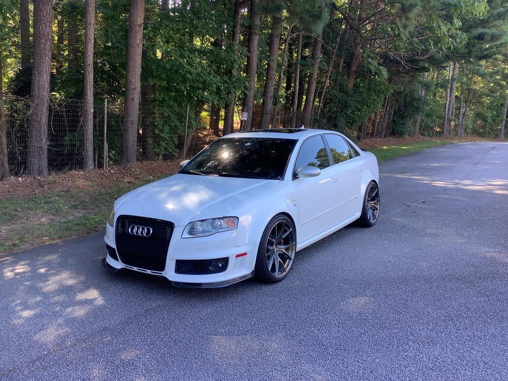 Compared to a contemporary S4, the RS model featured flared fenders, a vented front bumper, lowered ride height, and unique grilles. This example is reportedly one of 30 examples finished in Ibis White (LY9C) for the North American market, and JamStyling carbon-fiber accents have been added. Additional equipment includes a sunroof, adaptive xenon headlights, fog lights, bright-finished trim, rear parking sensors, and RS4 badging.