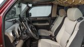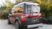 This 2008 Honda Element LX 4WD is finished in burgundy over gray cloth and equipped with a pop-up camper top, aftermarket dual–beam xenon headlights, a roof rack and basket, a ladder, a digital rear-view mirror, and a Kenwood touchscreen head unit with a back-up camera display. Additional features include 17″ Raceline wheels, air conditioning, reverse-hinged doors, a removable glass roof panel, tinted windows, sound deadening material, and a receiver hitch. Power is provided by a 2.4-liter inline-four paired with a five-speed automatic transaxle and a RealTime 4WD system.