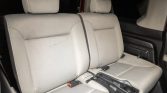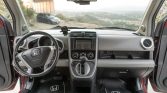 The cabin features seating surfaces trimmed in gray cloth, textured hard-plastic floors, and side-folding and removable rear seats. Additional equipment includes air conditioning, cruise control, electric windows, a removable glass sunroof panel, a Raingler cargo net, a digital rear view mirror, color-changing footwell lights, and an aftermarket Kenwood touchscreen head unit.