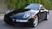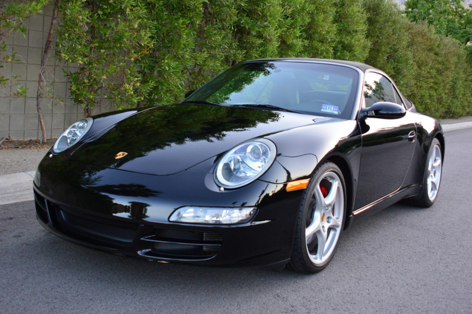 This 2008 Porsche 911 Carrera S is finished in black over a Black and Stone Gray leather interior and is powered by a 3.8-liter flat-six paired with a six-speed manual transaxle. Additional equipment includes the Sport Chrono Package Plus, a black convertible top, a speed-activated rear spoiler, automatic climate control, a Bose audio system, a Porsche navigation system, stainless-steel exhaust pipes, heated and power-adjustable seats, and 19″ alloy wheels.