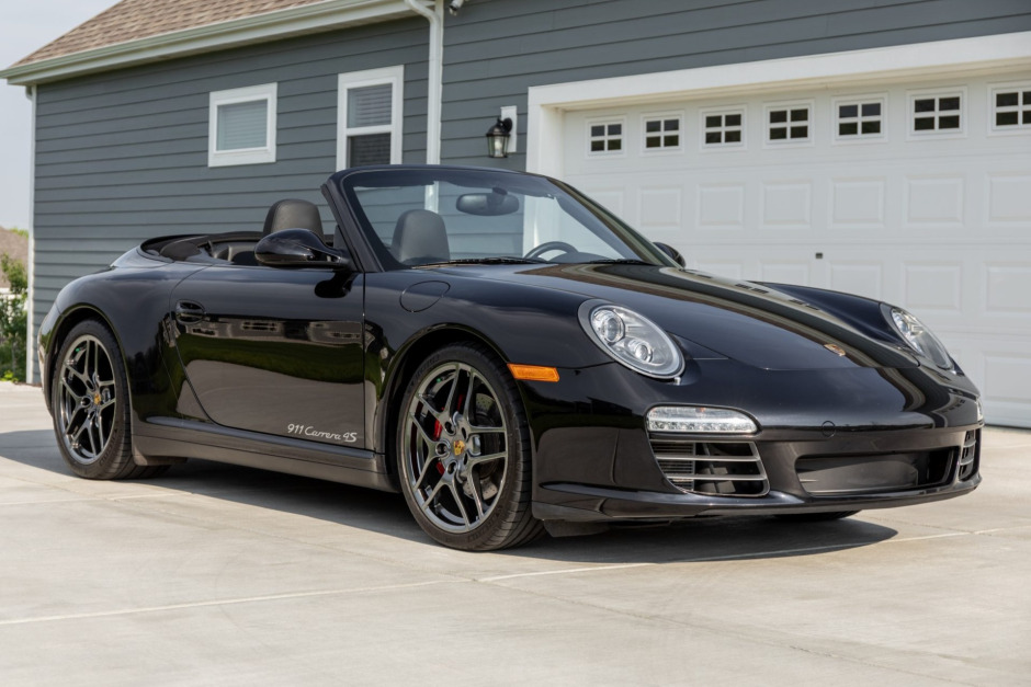 This 2009 Porsche 911 Carrera 4S cabriolet is finished in Basalt Black Metallic over black leather and is powered by a 3.8-liter flat-six driving all four wheels through a seven-speed PDK transaxle and a limited-slip rear differential. Equipment includes a black soft top, dynamic cornering lights, a sports exhaust system, the Sport Chrono Package Plus, heated and ventilated seats, a heated steering wheel, navigation, and Bose high-end audio. The car was delivered new to Porsche of North Olmsted in Ohio, and it was acquired by the seller in 2018.