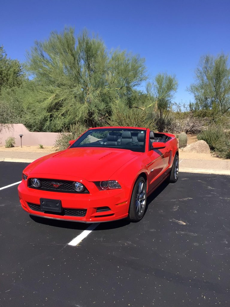 This 2014 Ford Mustang GT convertible was purchased new by the seller at Mangold Ford of Eureka, Illinois, and it is finished in Race Red over charcoal leather. Power comes from a 5.0-liter V8 paired with a six-speed automatic transmission and a limited-slip differential. Equipment includes a power-operated black soft top, 19″ wheels, Brembo brakes, a back-up camera, remote start, heated front seats, dual-zone automatic climate control, SYNC infotainment with navigation, and a Shaker audio system with…