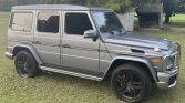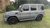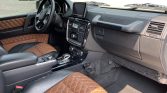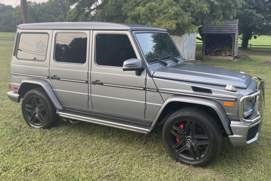 This 2016 Mercedes-AMG G63 is powered by a twin-turbocharged 5.5-liter V8 linked with a seven-speed automatic transmission, a dual-range transfer case, and three locking differentials. Finished in Designo Magno Platinum over Designo Light Brown and black leather upholstery, the truck is equipped with 20″ five-spoke AMG wheels, bi-xenon headlights with washers, a sunroof, Parktronic, a backup camera, blind-spot monitoring, heated and ventilated power-adjustable AMG sport front seats, a heated steering wheel, heated rear seats, navigation, a Harman Kardon…