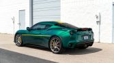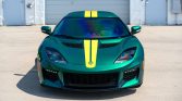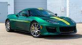 This 2017 Lotus Evora 400 is finished in Racing Green with yellow stripes and is powered by a supercharged 3.5-liter V6 mated to a six-speed manual transaxle with a Torsen limited-slip differential. Inside, the heated Sparco seats are trimmed in black leather and Alcantara and accompanied by an aftermarket audio system. Further equipment includes bi-xenon headlights, LED taillights, and an active exhaust system along with Bilstein dampers, Eibach springs, AP Racing disc brakes, and staggered-diameter alloy wheels.
