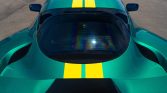 The Evora 400 features updated bodywork compared to earlier models, with changes including a front splitter and a three-piece rear spoiler. This example is finished in Racing Green (C203) and features yellow side and over-the-top stripes as well as a rear diffuser and a single center exit exhaust outlet. Bi-xenon headlights are paired with LED taillights out back, and further details include power-folding side mirrors, rear parking sensors, and a reversing camera.