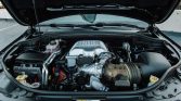 The black satin-finished 20″ aluminum wheels are mounted with Pirelli Scorpion Verde All Season tires measuring 295/45 all around. The Trackhawk rides on a Bilstein competition suspension with adaptive damping and is equipped with a Selec-Trac system with launch control and five drive modes. An Eibach anti-roll kit and lowering springs are installed. Stopping power is provided by yellow-finished six-piston front and four-piston rear Brembo brake calipers.
