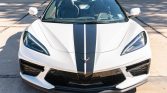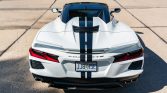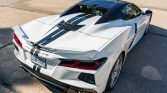 The eighth-generation Corvette debuted for the 2020 model year and is the first to feature a mid-engine layout. This example is finished in Arctic White with dual full-length Carbon Flash racing stripes and is equipped with LED headlights, power-folding side mirrors, front and rear cameras, rear Park Assist back-up sensors, a Z51 rear spoiler, quad exhaust outlets, and a Carbon Flash-finished power-retractable hardtop and nacelles.