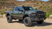 This 2022 Ram 2500 Power Wagon has been fitted with the American Expedition Vehicles (AEV) Prospector XL package, and it is powered by a 6.4-liter Hemi V8 linked with an eight-speed automatic transmission, a dual-range transfer case, and Tru-Lok front and rear differentials with revised gearing. The truck is finished in Olive Green Pearl-Coat and has a lifted suspension, Bilstein shocks, 17″ wheels, and 40″ tires along with heavy-duty bumpers, high-clearance fender flares, an air intake snorkel, a front brush guard, a bed rack, LED auxiliary lights, and a WARN winch. Other features include a surround-view camera system, Harman Kardon audio, Uconnect infotainment, and heated and ventilated front seats trimmed in black leather.